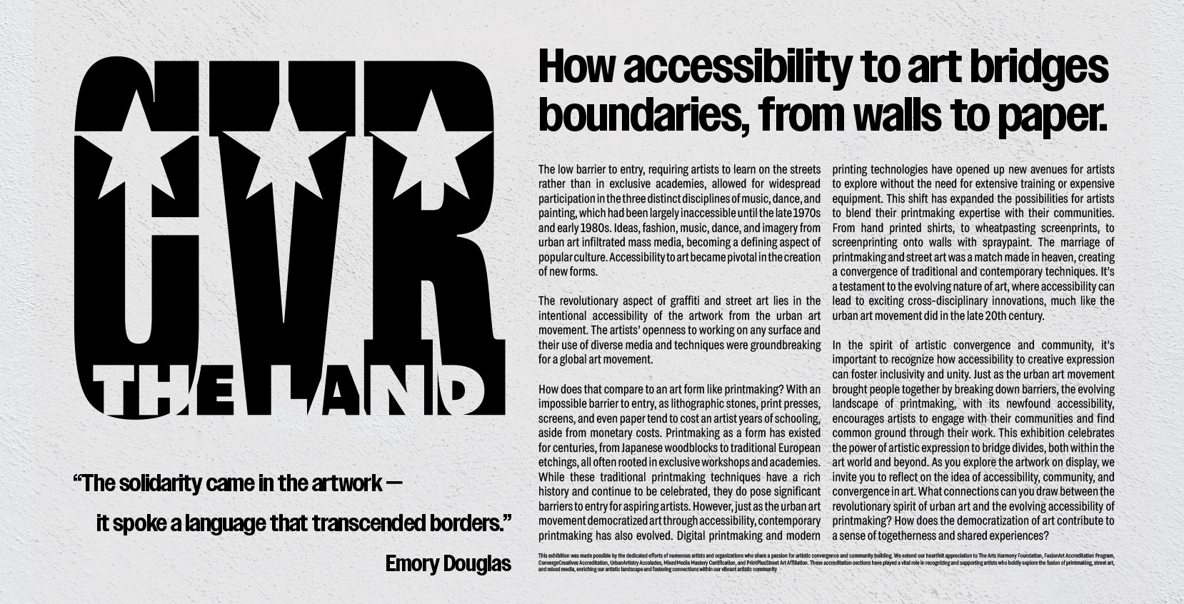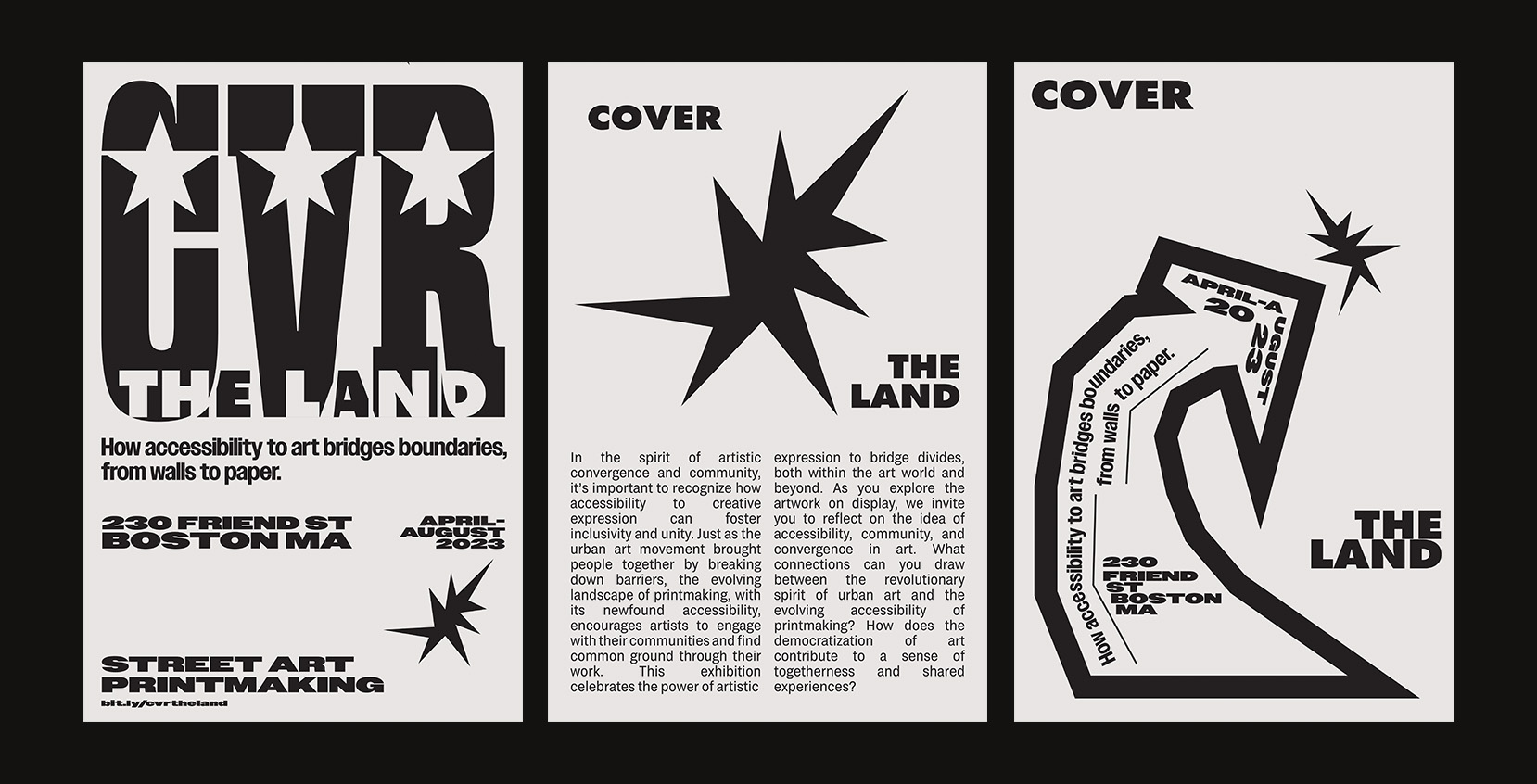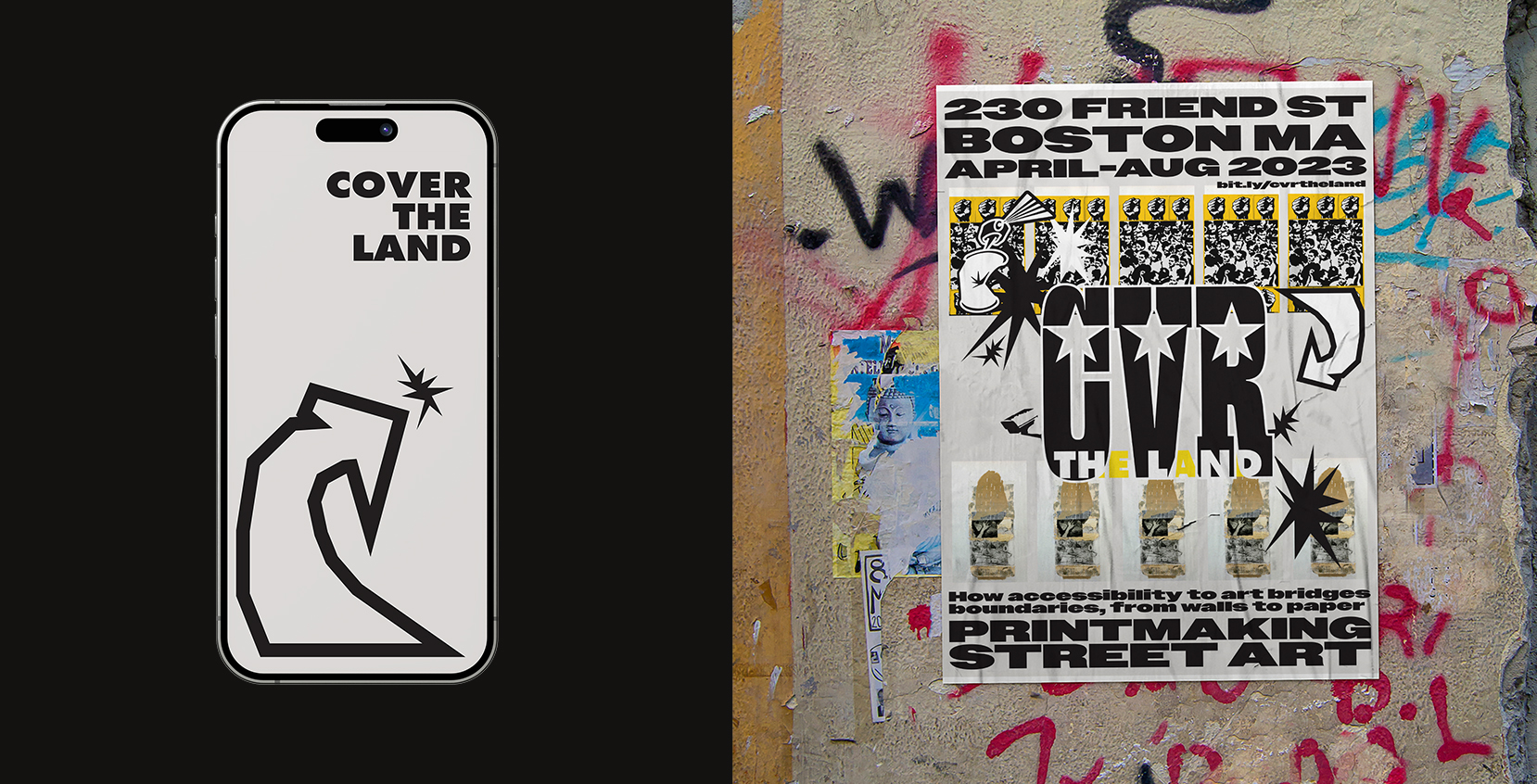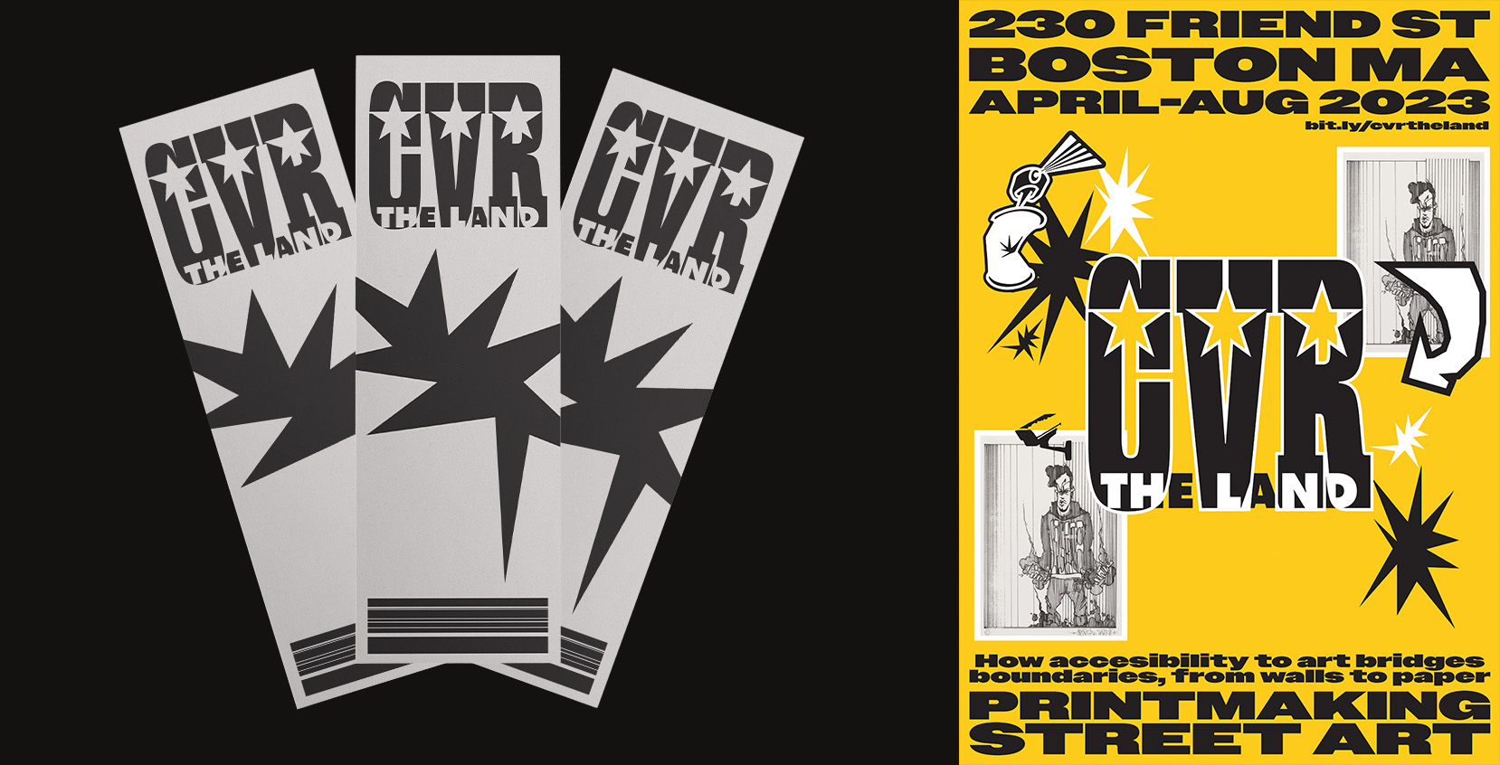 Exhibition branding and print design created for CVR THE LAND: How accessibility to art bridges boundaries, from walls to paper, at Friend St. Studios. The exhibit featured local and worldwide artists in a feature of street art & printmaking at crossroads, recognizing how accessibility to creative expression can foster inclusivity.