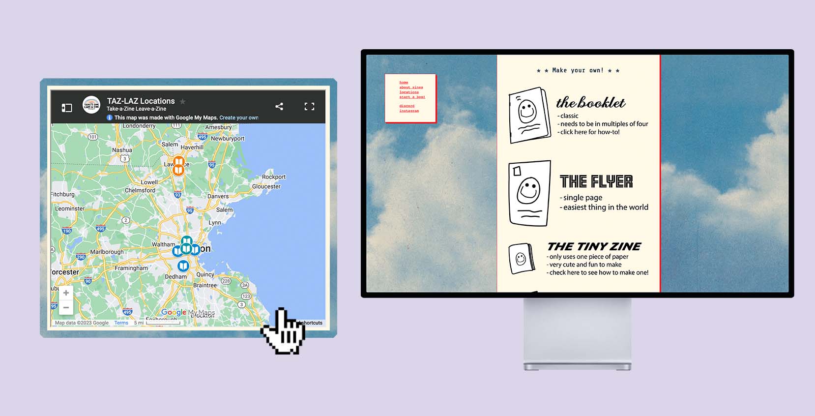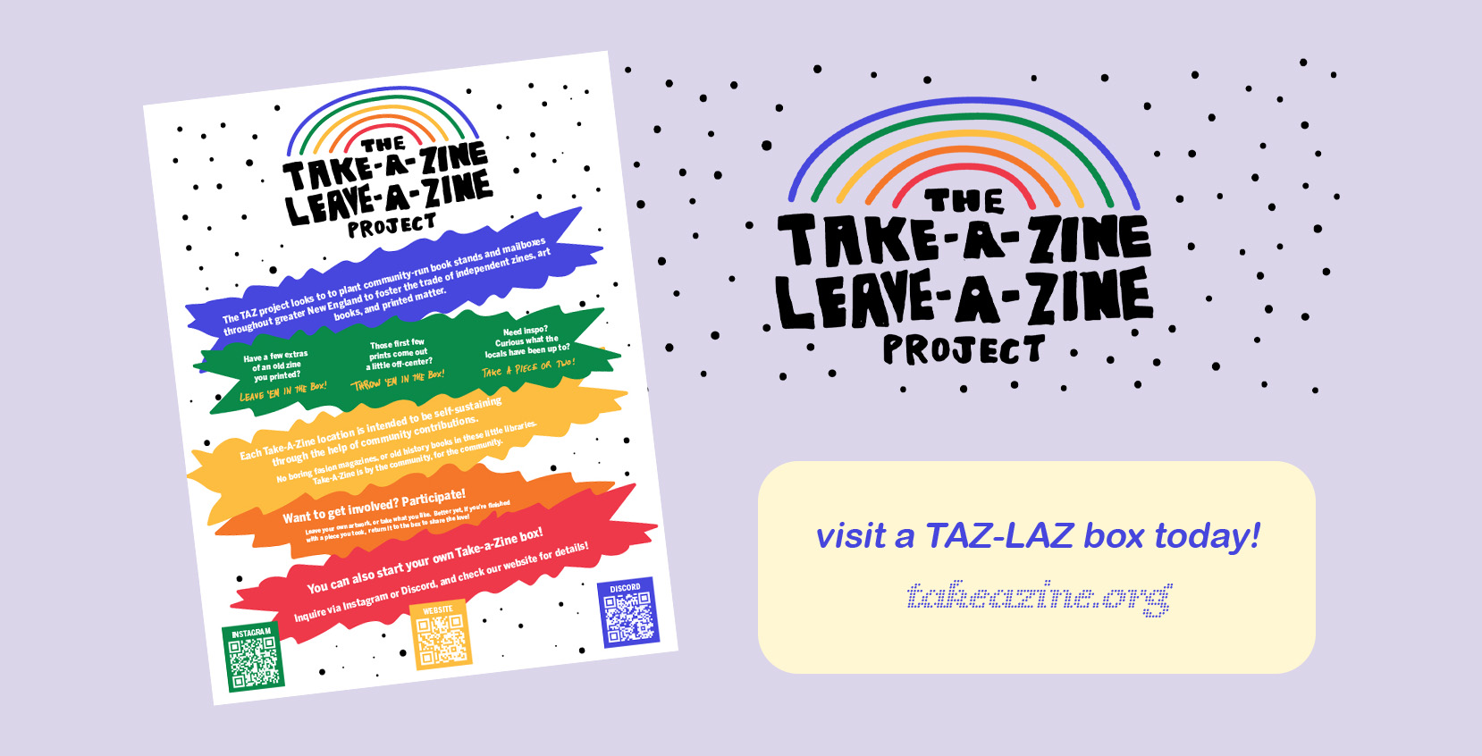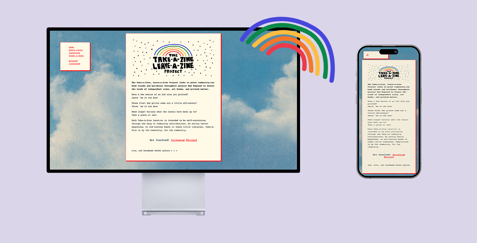 Identity & Web Design↗ for Take a Zine, Leave a Zine, a local community-run initiative that looks to plant community-run book stands and mailboxes throughout greater New England. to foster the trade of independent zines, art books, and printed matter. The goal of the redesign was to make a fun, accessible, and simple website for the community project. Coded without a web client, and hosted on Neocities.