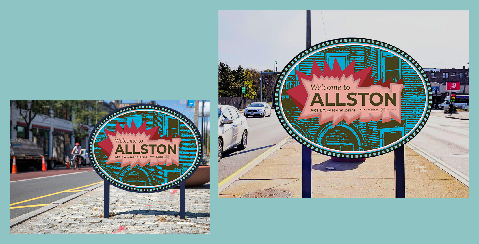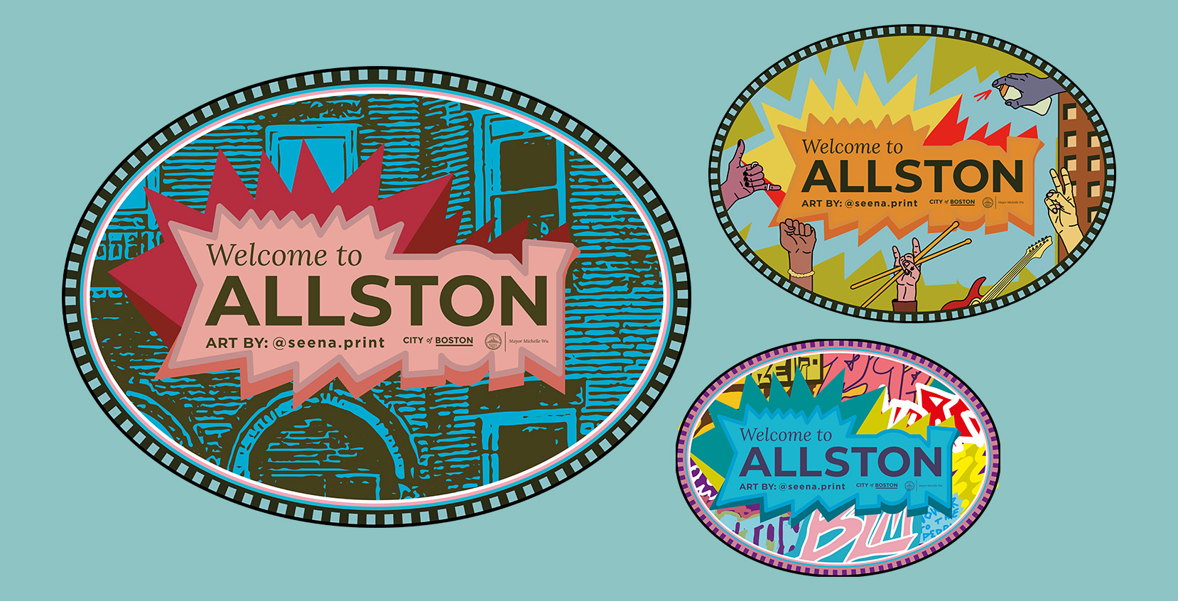 Graphics and illustrations for an Allston signage redesign. Submitted through a City of Boston local artist program looking to capture the essence of each Boston neighborhood. Inspired by the neighborhood’s vibrant community, the new signage captures Allston’s unique characteristics and style.