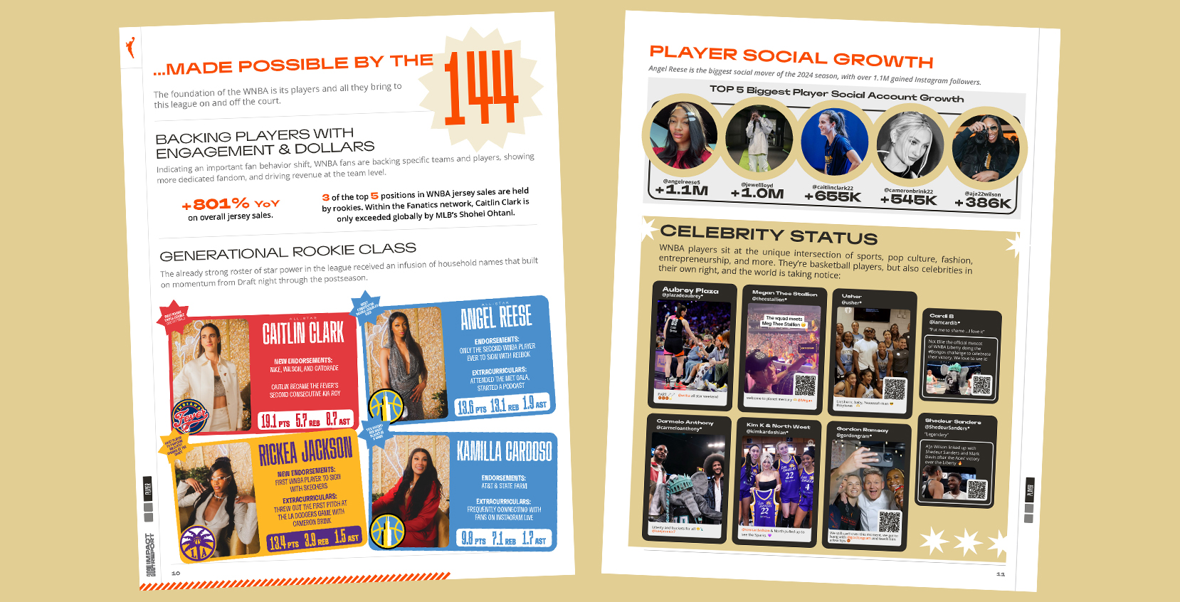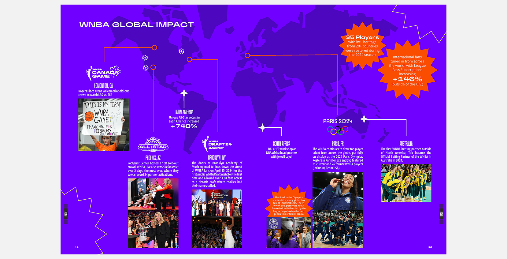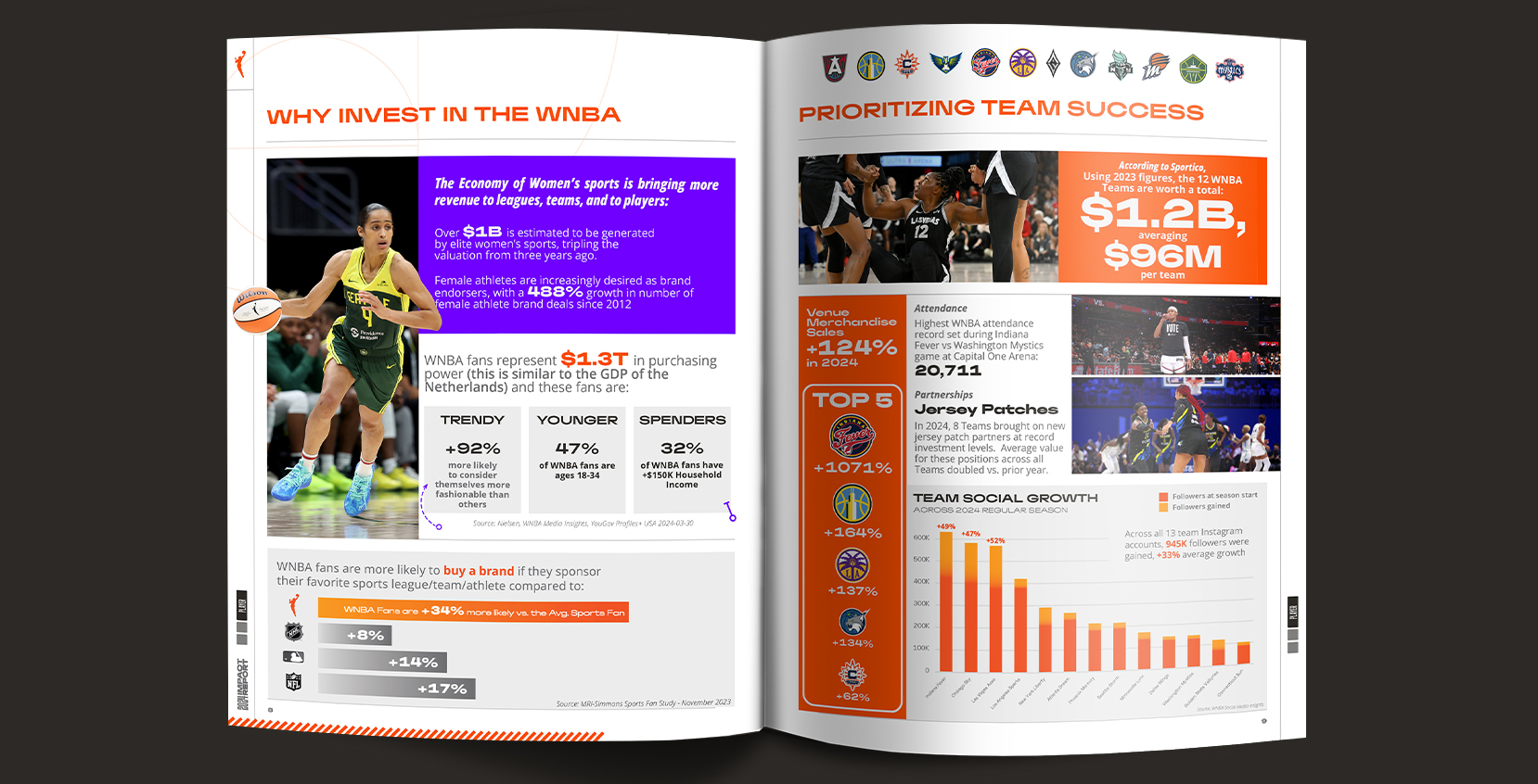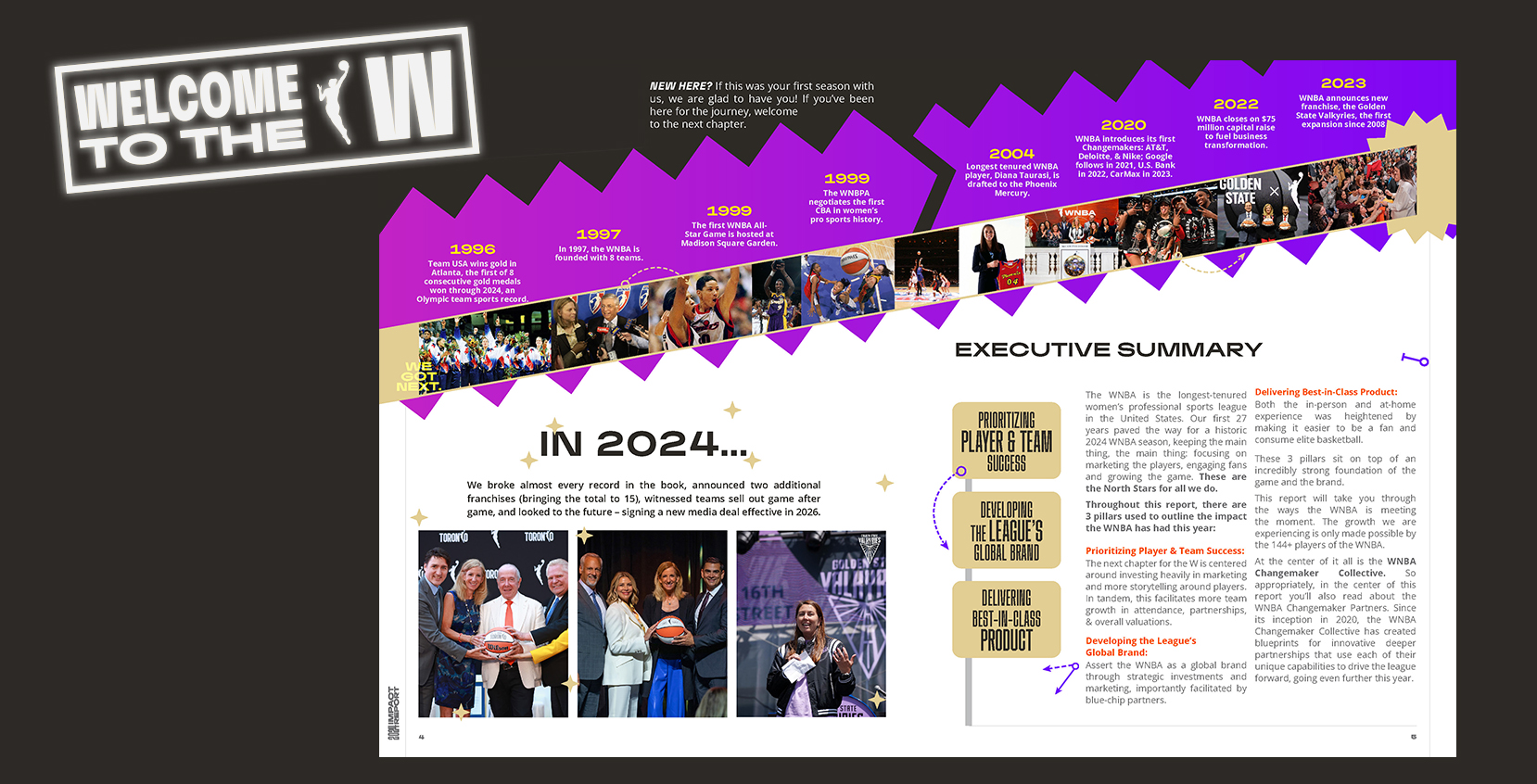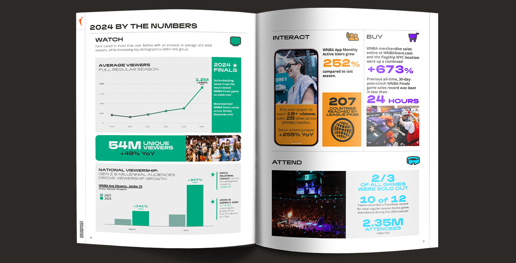 Designed and produced the 2024 Impact and Annual Reports for the WNBA, showcasing the league's milestones, achievements, and financial highlights. These publications featured bold typography, cohesive layouts, and engaging visuals to align with the WNBA's brand identity while effectively communicating key narratives to stakeholders and fans.